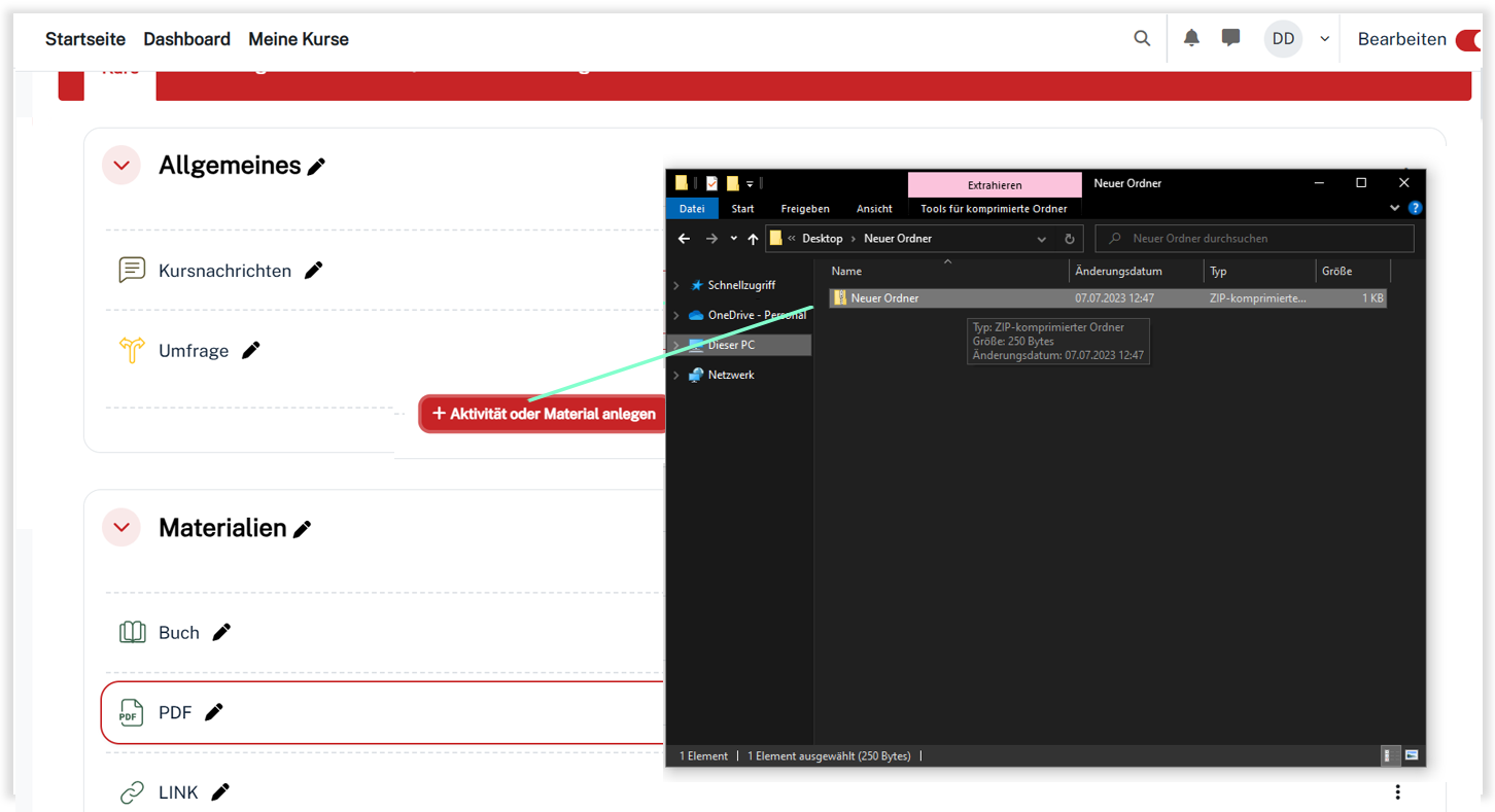 Dateien entpacken und Verzeichnisse anlegen aus und klicken Sie dann auf den Button Hochladen.Bearbeiten und Einstellungen bearbeiten können im Nachgang im Reiter Einstellungen weitere Anpassungen vorgenommen werden (Anzeige direkt im Kurs, Download erlauben, etc.).Ein Verzeichnis kann im Nachhinein angepasst werden, in dem Dateien gelöscht oder weitere hinzugefügt werden. Auch Unterordner können nachträglich hinzugefügt werden.