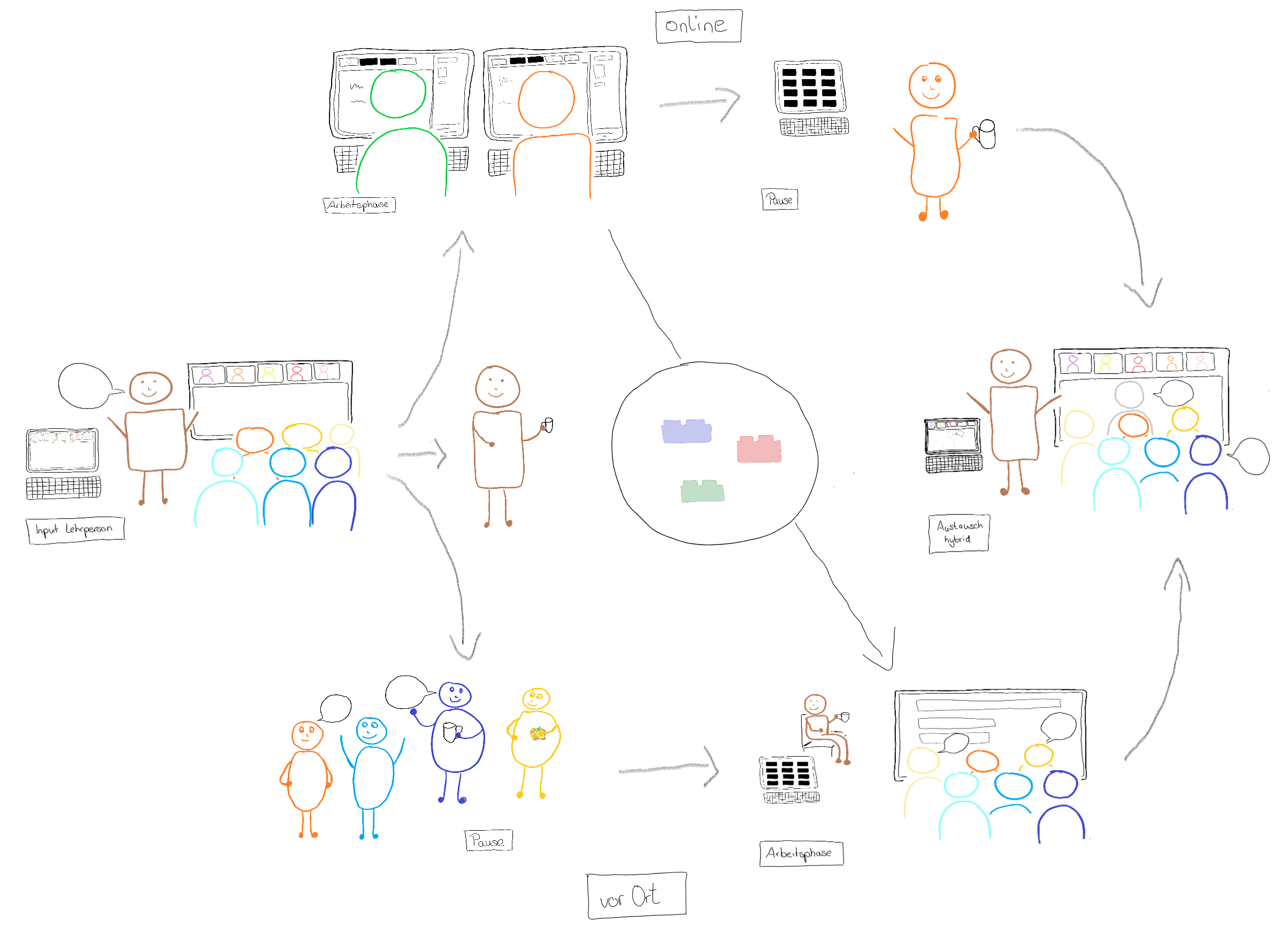 Nach einem theoretischen Input durch die Lehrperson haben die online Teilnehmenden Pause. Die vor Ort Teilnehmenden sammeln Fragen zum Input. Wenn die online Teilnehmenden aus der Pause zurück sind, gehen die vor Ort Teilnehmenden in Pause. Die online Teilnehmenden recherchieren nun die Antworten auf die gesammelten Fragen. Im Plenum werden die Antworten präsentiert und gemeinsam diskutiert.