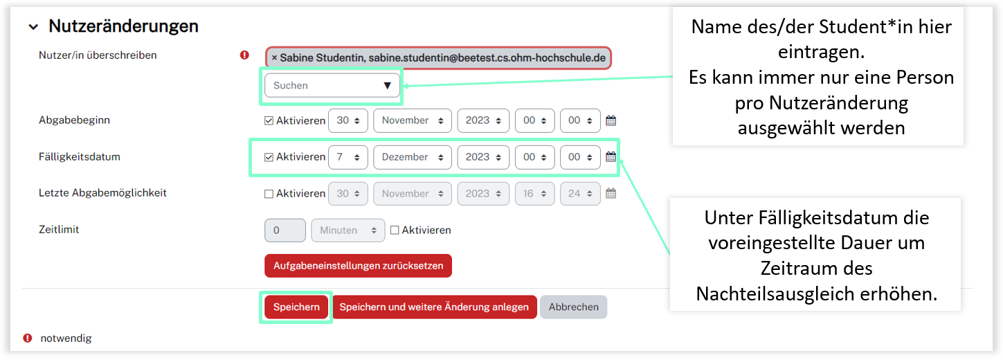 Der Nachteilsausgleich bei E-Prüfungen kann in Moodle über die Nutzeränderungen bei der Aktivität Test beziehungsweise über die Verfügbarkeitsänderungen für Nutzer bei der Aufgabe umgesetzt werden.
