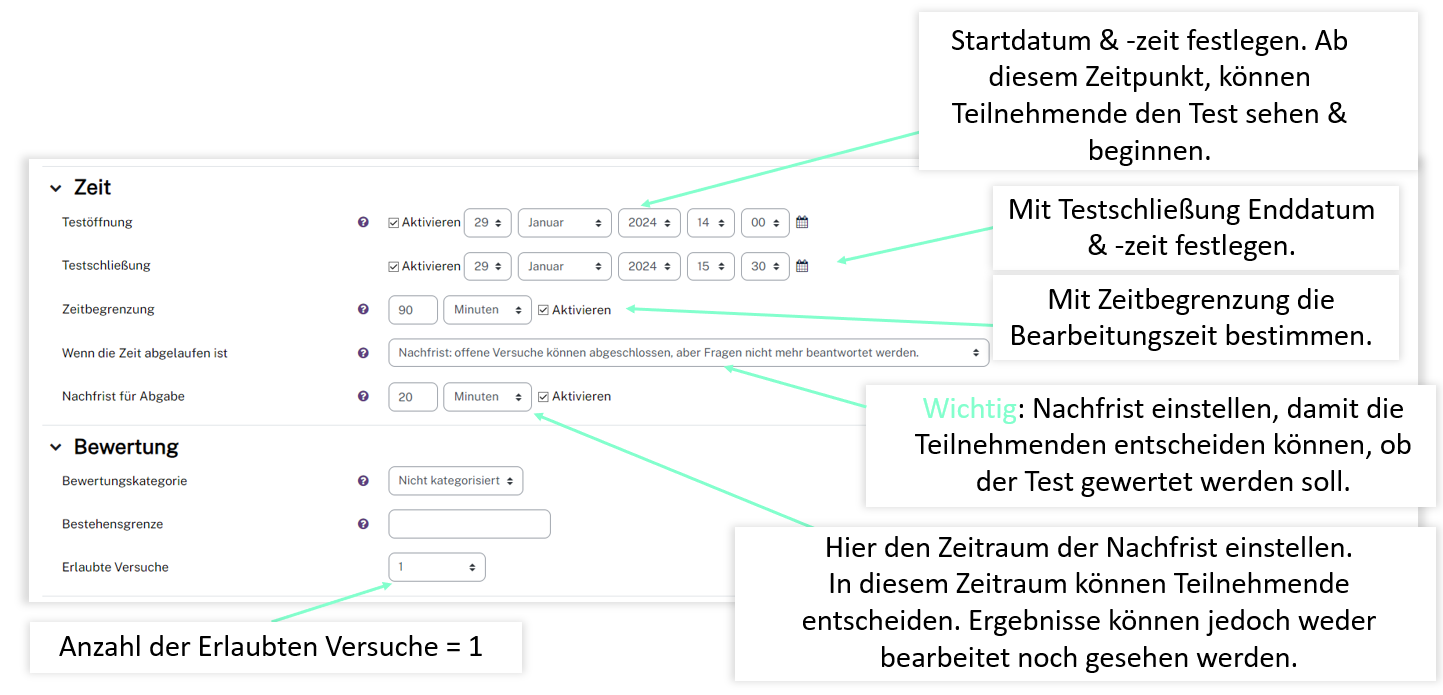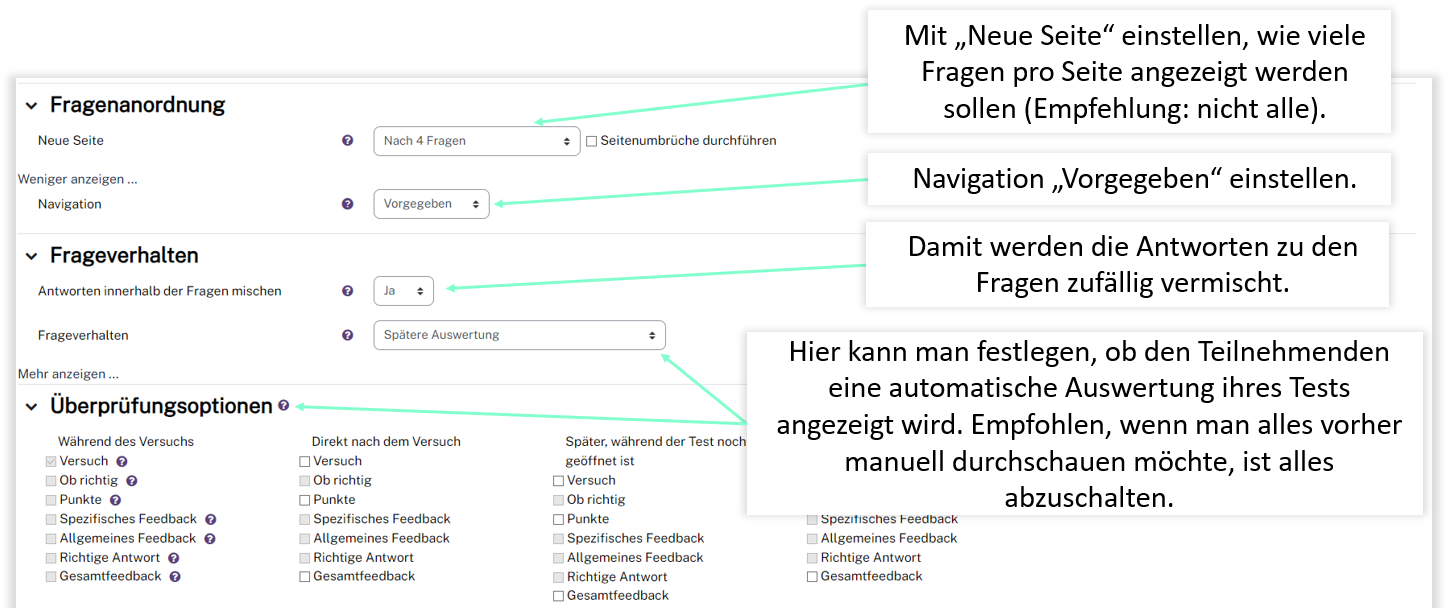 Für den Test im Prüfungskontext beachten Sie folgende Grundeinstellungen.