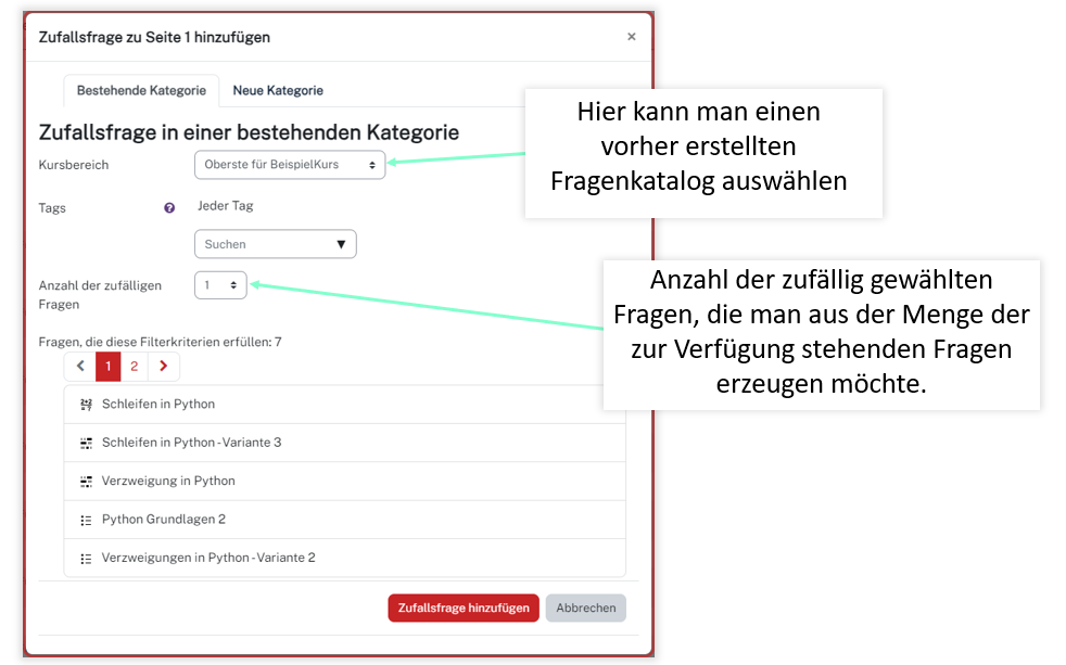 Die Zufallsfrage ist eine Möglichkeit einem Test eine zufällige Frage aus einem Fragenkatalog am Ende hinzuzufügen. Hierfür klicken Sie wieder rechts auf Hinzufügen, dann Zufallsfrage hinzufügen.