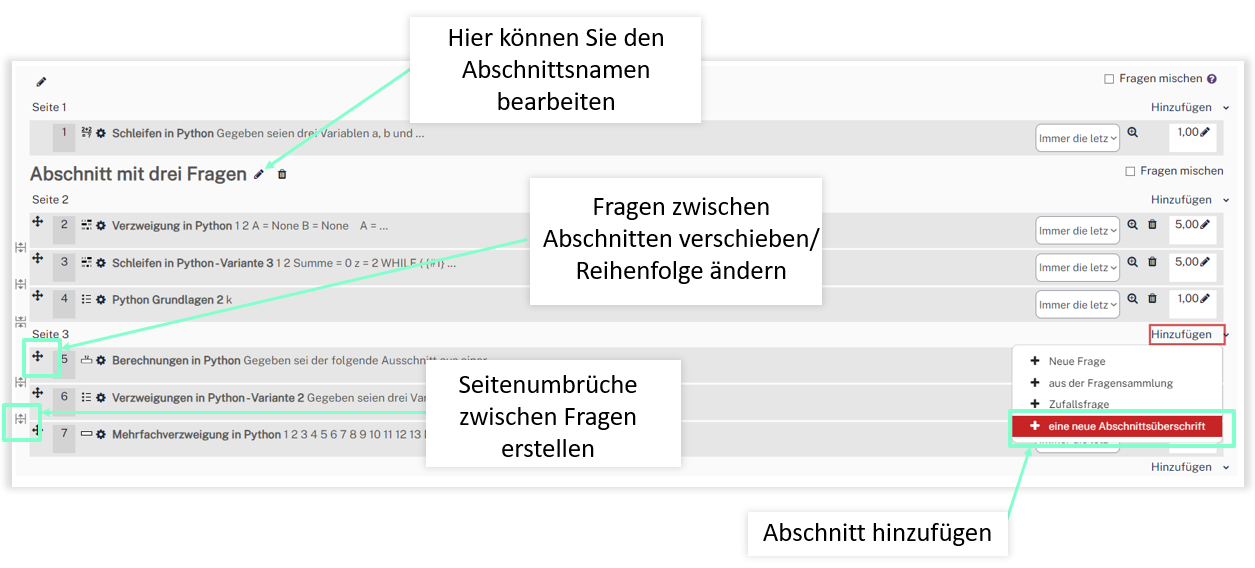 Testabschnitte grenzen unterschiedliche Bereiche im Test ab und können Themenbereiche definieren, wobei die Reihenfolge der Abschnitte in jedem Test gleich bleibt. Für einen Abschnitt braucht man mindestens drei Fragen oder man erstellt einen eigenen Bereich für die Eigenständigkeitserklärung, die üblicherweise am Ende eines Tests erscheint.