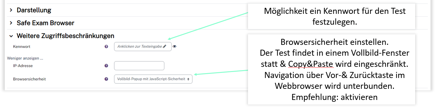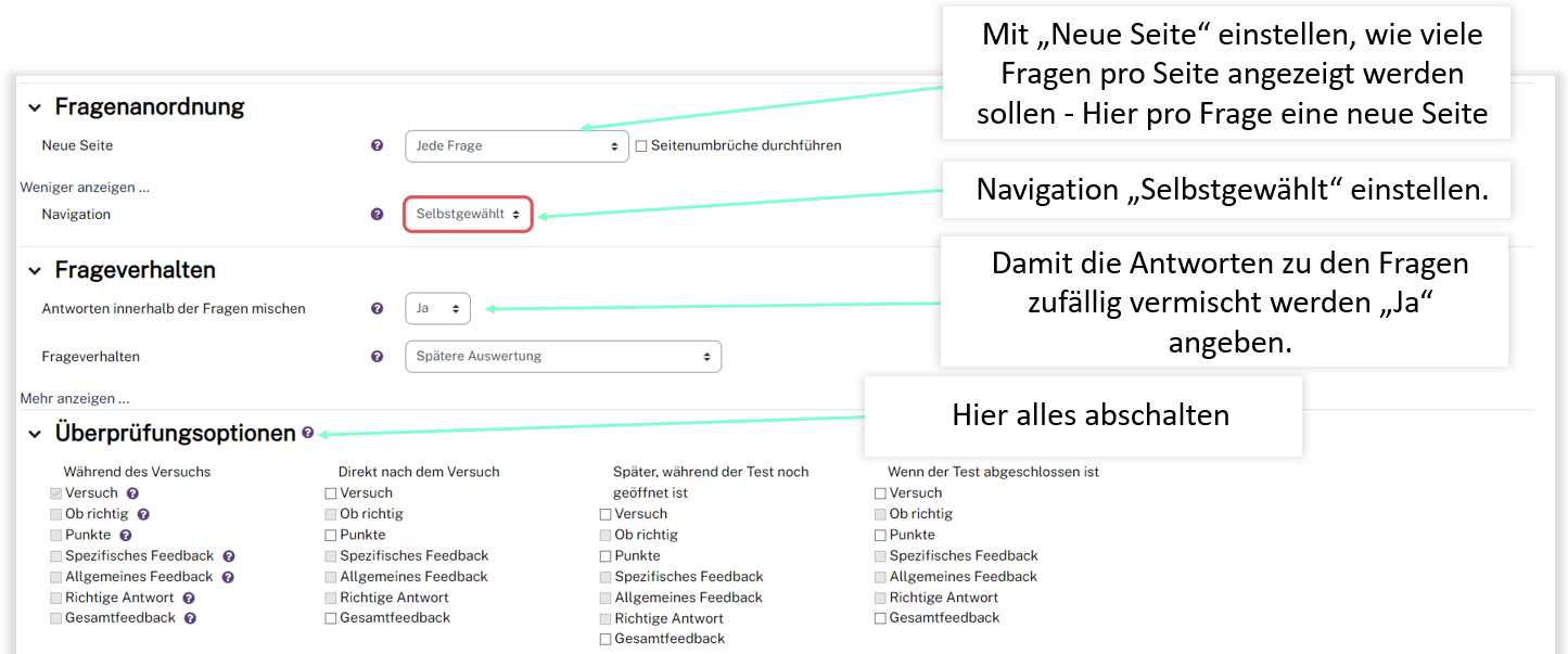 Für den Test im Prüfungskontext beachten Sie folgende Grundeinstellungen.