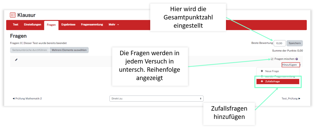 Die Zufallsfrage ist eine Möglichkeit einem Test eine zufällige Frage aus einem Fragenkatalog am Ende hinzuzufügen. Hierfür klicken Sie wieder rechts auf Hinzufügen, dann Zufallsfrage hinzufügen.