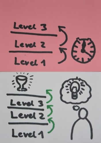 kompetenzbasierter_fortschritt.jpgDie Hochschule folgt, ebenso wie die Schule, einer zeitlichen Taktung. Studierende schreiten nach einem halben Jahr (Semesters) zu den nächsten, meist etwas schwereren und anspruchsvolleren Inhalten, fort. Diese Taktung setzt sich innerhalb des Semesters fort, auch hier erfolgt das Fortschreiten nach einem Wochenraster. Dieses Vorgehen ist problematisch, denn oft werden Studierende mit fortgeschrittenen Inhalten konfrontiert, bevor sie die grundliegenden Inhalte verstanden und verinnerlicht haben. Gamification implementiert hingegen typischerweise ein kompetenzorientiertes Vorgehen, d.h., dass fortgeschrittene Inhalte bearbeitet werden können sobald grundlegende Inhalte gemeistert wurden.