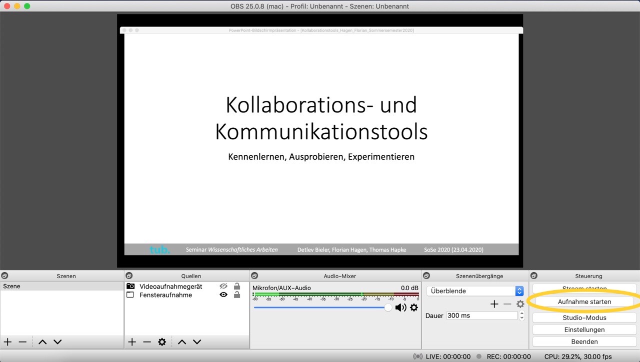 Nachdem wir dafür gesorgt haben, das durch unsere Fensteranordnung kein Folieninhalt verdeckt wird und optional der Chroma-Key-Effekt nach unseren Vorstellungen funktioniert, haben wir die wichtigsten Vorbereitungen abgeschlossen. Nun sind es nur noch wenige Schritte zum Aufnahmestart.