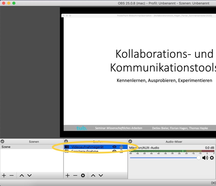 Nach Auswahl der beiden Aufnahmequellen sollten Foliensatz und Webcam-Ausschnitt zu sehen sein.