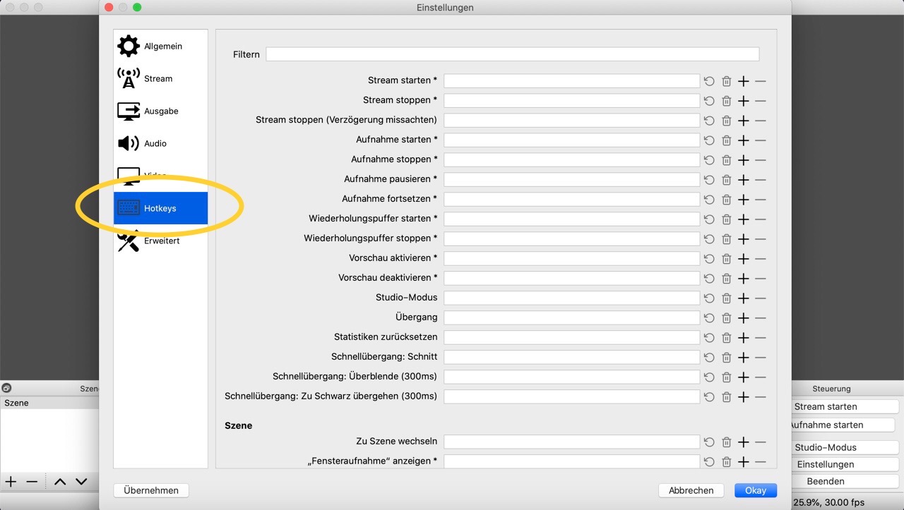 Komfortabler ist vor Aufnahmebeginn jedoch die Vergabe von „Hotkeys“ (Tastaturkürzel) für OBS. Somit lässt sich beispielsweise der Aufnahmebeginn und der Aufnahmestopp mit Hilfe von selbst vergebenen Makros steuern. Die Hotkey-Einstellung ist über das Einstellungsmenü (unten rechts) und Klick auf „Hotkeys“ erreichbar: