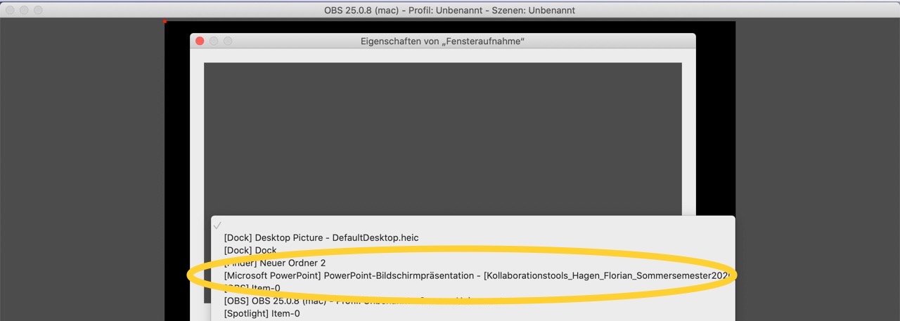 Auswahl der Powerpointpräsentation für die Bildschirmaufnahme.