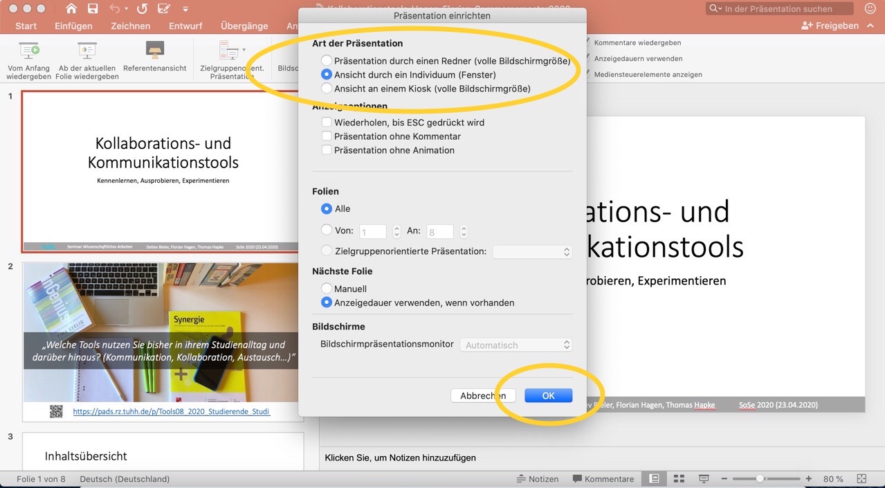 Wir klicken in Powerpoint auf „Bildschirmpräsentation“ und anschließend auf „Bildschirmpräsentation einrichten“, Hier wählen wir „Art der Präsentation“ aus und setzen einen Haken bei „Ansicht durch ein Individuum (Fenster)“. Dieser Vorgang wird im Fenster nun durch einen Klick auf „ok“ bestätigt.