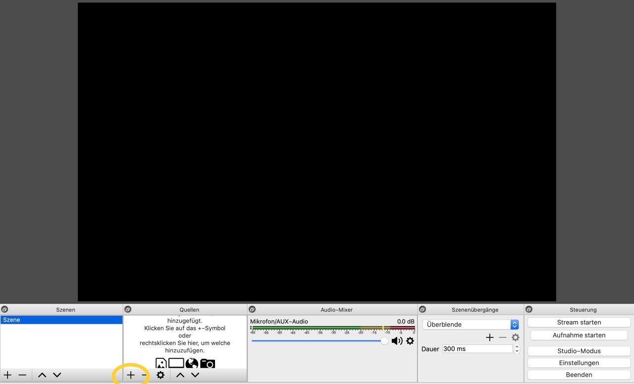 Diese beiden „Quellen“ wählen wir über das „+“-Zeichen (hinzufügen) für unsere Bildschirmaufzeichnung aus: