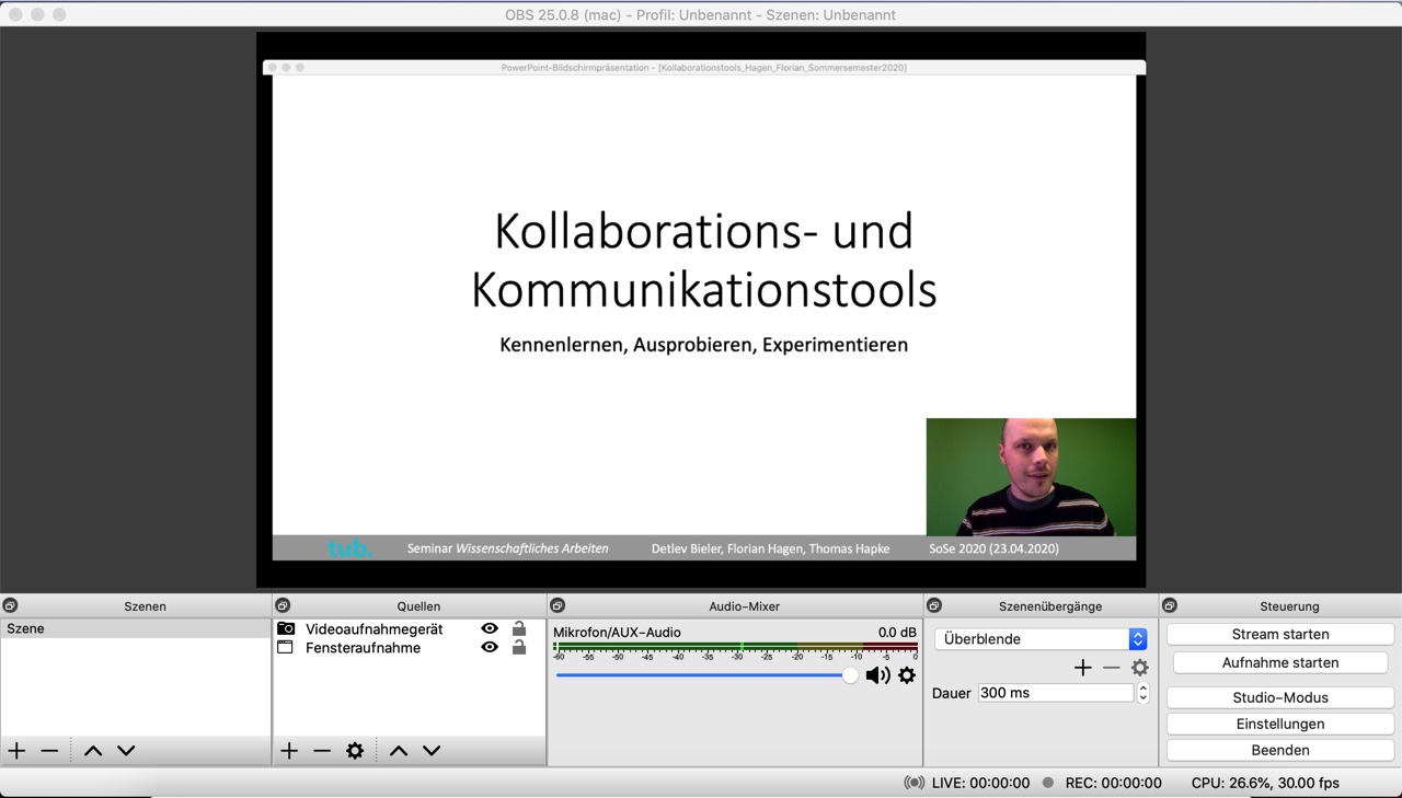 Nach Auswahl der beiden Aufnahmequellen sollten Foliensatz und Webcam-Ausschnitt zu sehen sein.