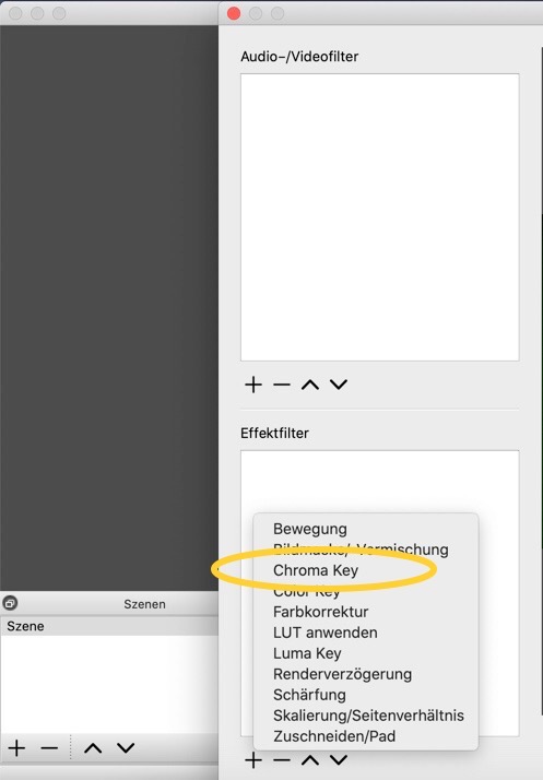 Dieser Effekt lässt sich über einen Rechtsklick auf unser „Videoaufnahmegerät“, Auswahl von „Filter“ und schließlich Klick auf „Chroma Key“ justieren. Chroma Keying steht dabei für das Ersetzen unserer vordefinierten Farbe: