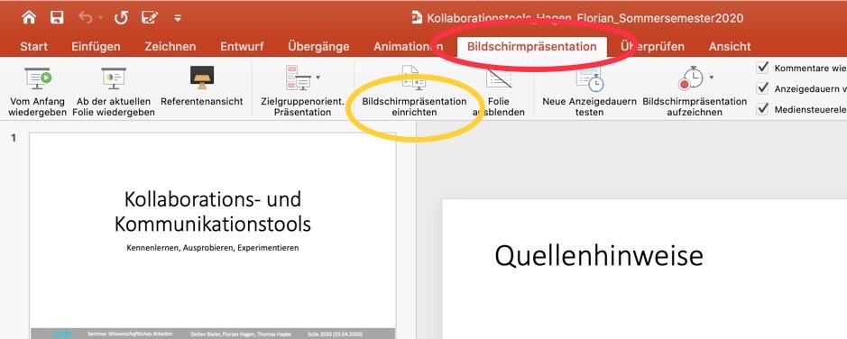 Wir klicken im Reiter „Bilschirmpräsentation“ auf „Bildschirmpräsentation einrichten“.