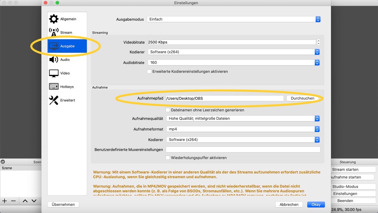 Der lokale Ablageort für die Videoaufzeichnung kann in der Menüleiste über „Steuerung“ → „Einstellung“ → „Ausgabe“→ „Aufnahmepfad“ angepasst werden: