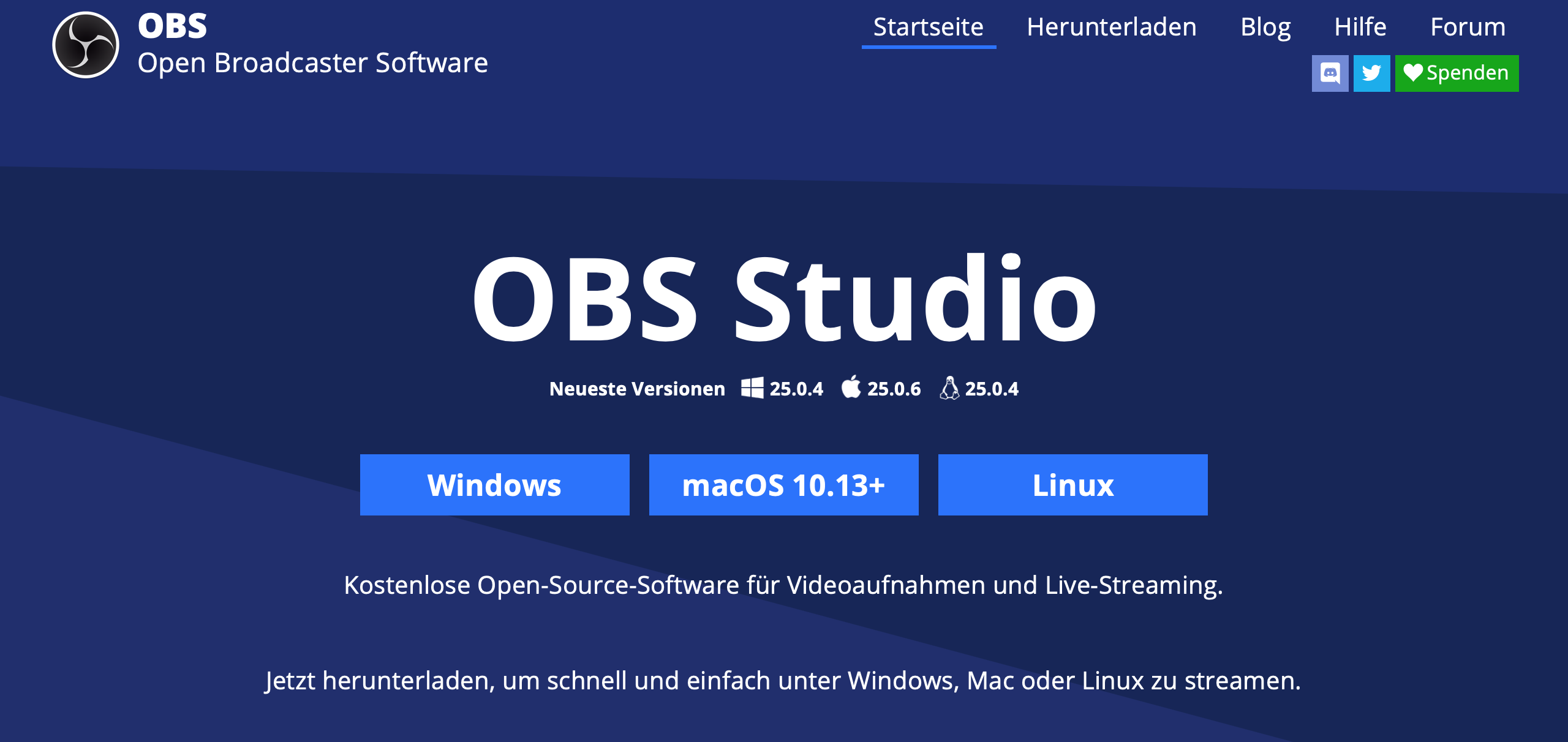 Zusätzlich benötigen wir für die Aufzeichnung einer Präsentation den Foliensatz (für einen Testlauf eignen sich sonst auch andere Dokumente oder Anwendungsfenster) und die OBS-Software. OBS ist verfügabr für Windows-, Mac- und Linux-Systeme. Der Download kann nach Auswahl der benötigten Version über https://obsproject.com/de/welcome erfolgen: