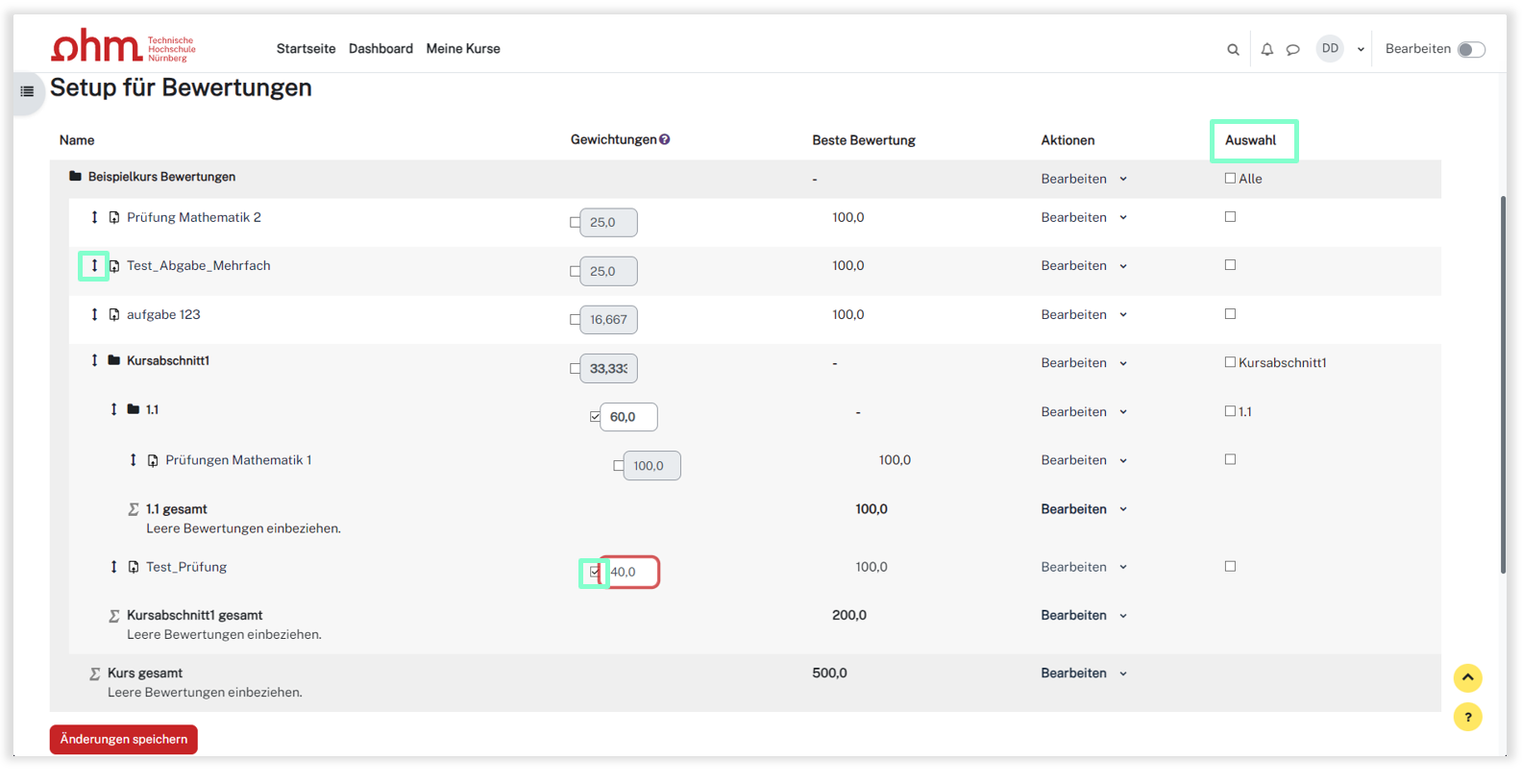 Erweiterte Einstellungen für die Bewertungen finden Sie im Dropdown-Menü oben links unter Setup für Bewertungen. Hier lässt sich die Gewichtung der verschiedenen Aufgaben einsehen und nach Anklicken des Kästchens daneben auch ändern. Sie können verschiedene Kategorien hinzufügen und die Aufgaben hierarchisch verteilen, sodass Sie die Gewichtungen beliebig anpassen und aufeinander abstimmen können.