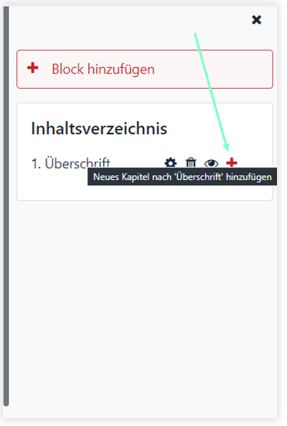 7. Um weitere Kapitel anzulegen, öffnen Sie die Blockleiste über das Pfeilsymbol auf der rechten Seite Ihres Bildschirms und und klicken Sie im Inhaltsverzeichnis auf das Plus-Symbol neben einem bestehenden Kapitel.