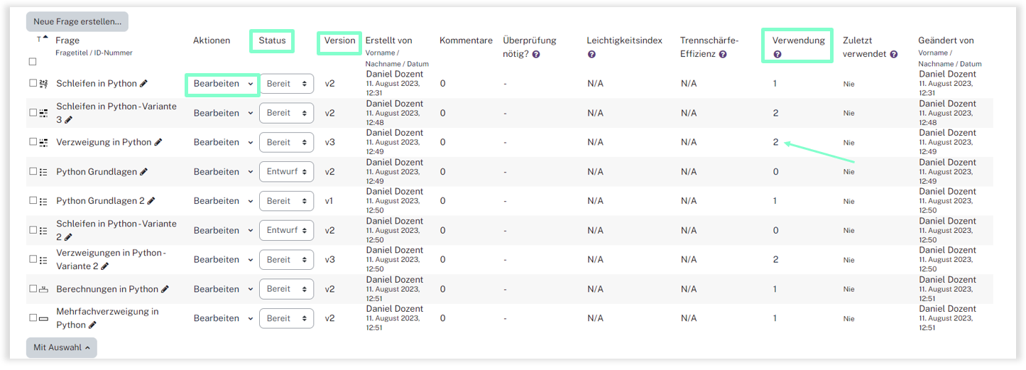 - Verwendung: Die Verwendung gibt an, in wie vielen Tests die Frage benutzt wird. Sie können auf diese Zahlen klicken und mehr über die Verwendung erfahren.