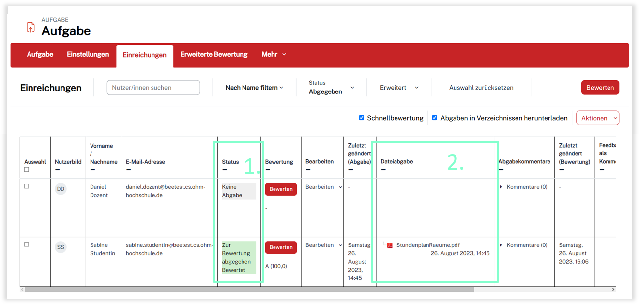 - Sie sehen eine Übersicht aller Teilnehmer mit dem Status der Abgabe und der Bewertung.