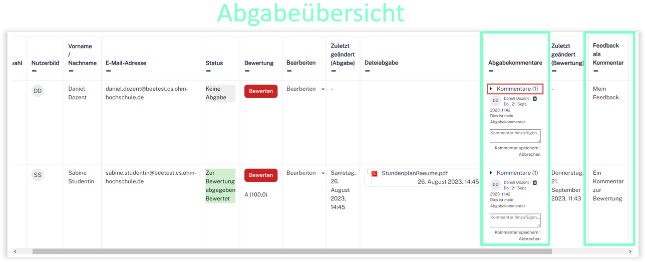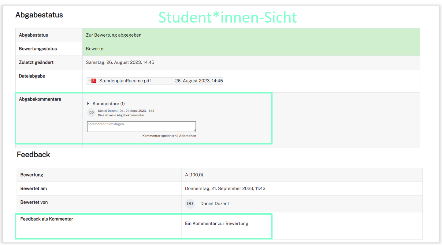 Beide Kommentare werden in der Abgabenübersicht angezeigt.
