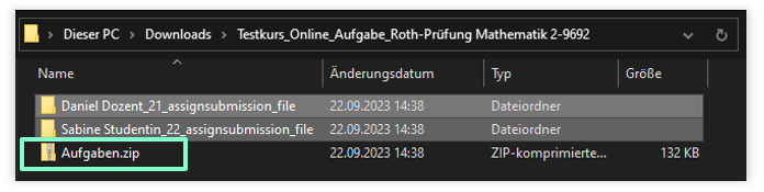 Mit Alle Abgaben umbenannt herunterladen werden die Abgaben als Zip-Datei auf Ihrem PC gespeichert. Die Dateien können dort korrigiert werden, allerdings aufgrund der Umbenennung NICHT wieder zurück in den Kurs gespielt werden.