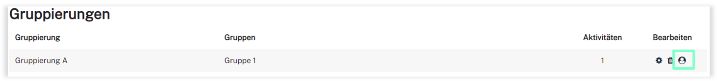 Gruppierungen eignen sich dafür, Gruppen zusammen zu fassen. Für die Gruppierungen teilen Sie zuerst Ihre Teilnehmer*innen in Gruppen ein und wählen anschließend Gruppierungen im DropDown Menü links oben unter Teilnehmer aus. Hier erstellen Sie die gewünschten Gruppierungen und klicken je rechts auf das Profil-Symbol um die Gruppen den Gruppierungen zuzuteilen.