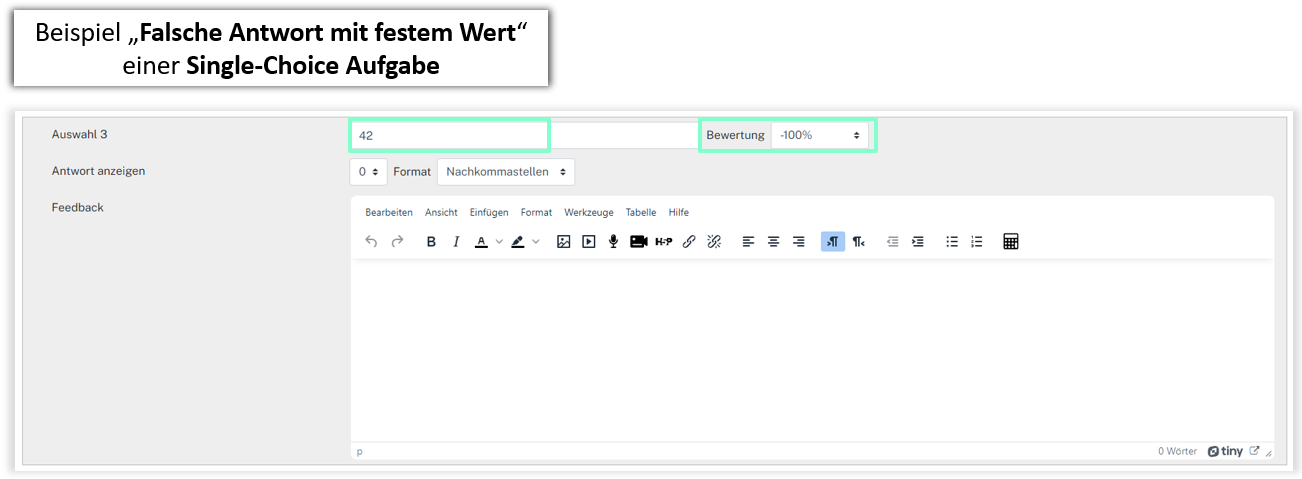 Nachdem die Frage-Einstellungen ausgefüllt sind, müssen die Antworten erstellt werden. Im Folgenden werden Beispiele zu richtigen & falschen Antworten in Bezug auf Single-Choice Aufgaben gezeigt.