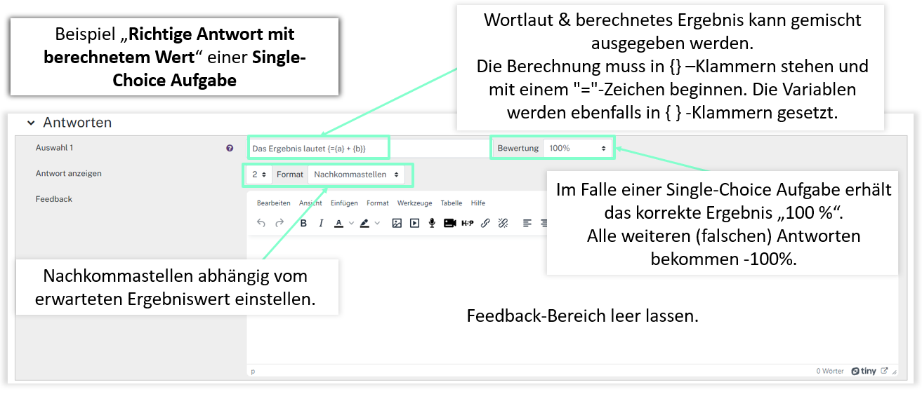 Für eine feste falsche Antwort bei Single-Choice Aufgaben geben Sie diese unter Auswahl xy ein und setzen die Bewertung auf -100%. Falls der Ergebniswert „0“ betragen soll, ist es notwendig Worte zu ergänzen ( „Das Ergebnis ist 0“) oder die Ziffer in geschweifte Klammern zu setzten ({0}).