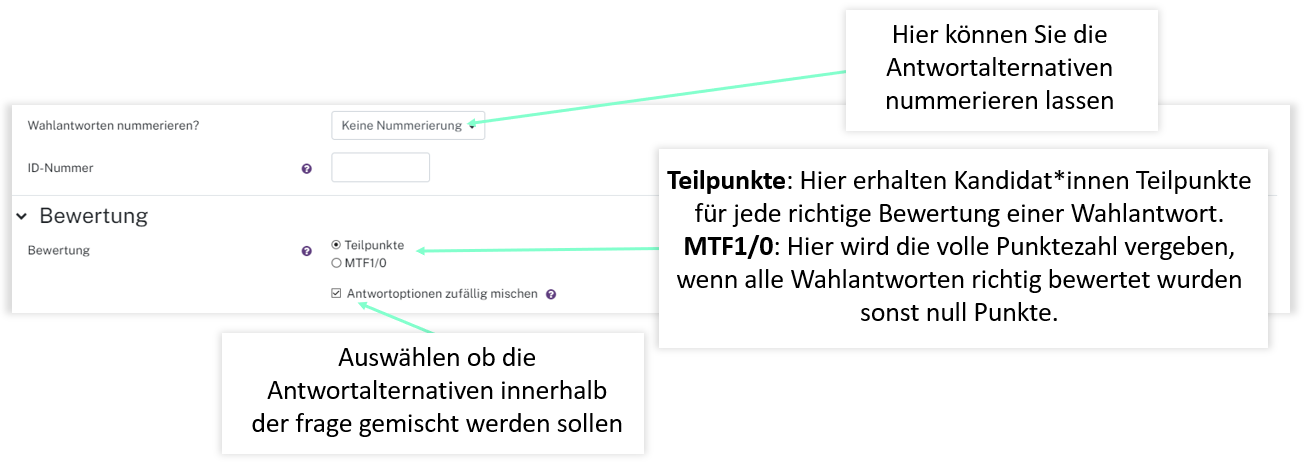 Mit dem MTF (ETH) Format können Fragen mit mehreren Antworten angelegt werden. Der Unterschied zum bisherigen Format besteht in der späteren Darstellung der Frage für die Studierenden sowie bei derAuswertung, bei der jede Antwortalternative bewertet wird.