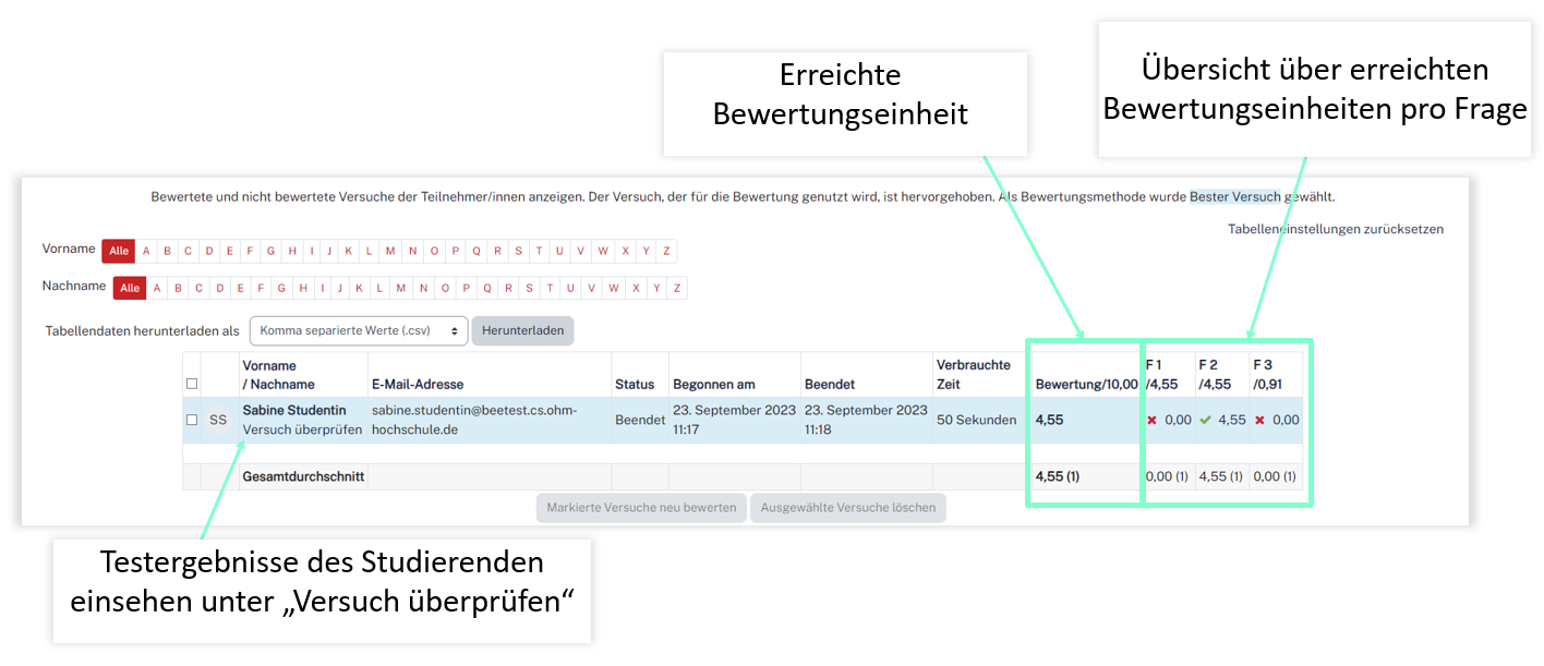 Unter Versuch überprüfen gelangen Sie in die Detailansicht des Studierenden mit den einzelnen Fragen und entsprechenden Antworten.