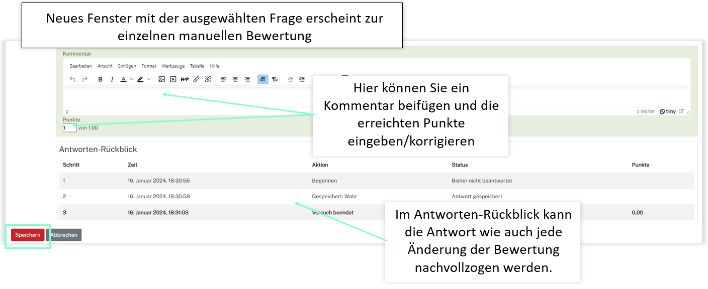 Nun können Sie manuell unter jeder Frage bei Kommentieren oder Punkte überschreiben die Punktzahl ändern oder ein Kommentar zur Antwort abgeben.