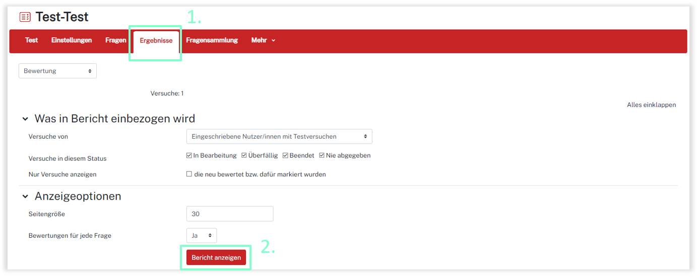 Um die Auswertungen der Testteilnehmenden aufzulisten, wechseln Sie in den Test und klicken in der Kursnavigation auf Ergebnisse und anschließend auf Bericht anzeigen.