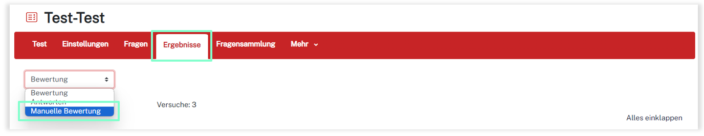 Um alle Fragen anzeigen zu lassen und anschließend alle Ergebnisse zur selektierten Frage zu bewerten, navigieren Sie in der Kursnavigation des Tests zu Ergebnisse und wählen anschließend im DropDown-Menü oben links Manuelle Bewertung.