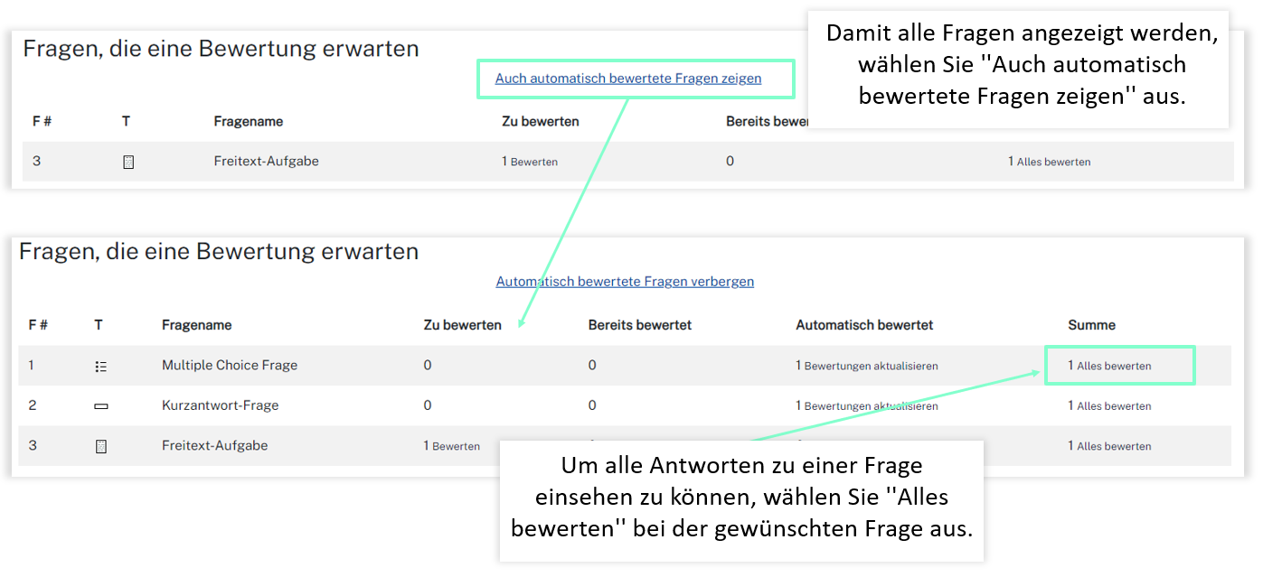 Nachdem Sie ihren Test erstellt haben und dieser von den Kursteilnehmenden bearbeitet wurde, können Sie diesen auswerten und Ihre Ergebnisse sammeln. Sie können entweder nach Studierenden oder nach Fragen auswerten.