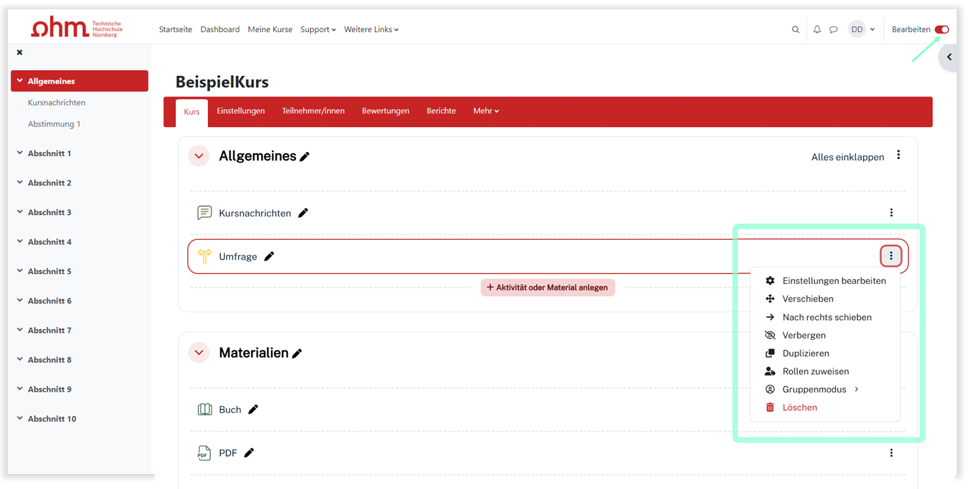 2. Schalten Sie anschließend den Bearbeitungsmodus Ihres Kurses über den Schalter Bearbeiten in der rechten oberen Ecke an.