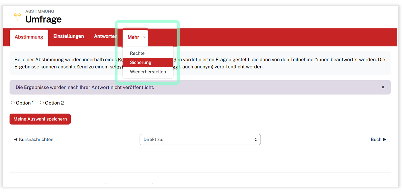 4. Wählen Sie nun in der Kursnavigation Mehr und anschließend Sicherung. Ähnlich wie bei der Kurssicherung können Sie weitere Einstellungen vornehmen, z.B. einen Namen für die Sicherungsdatei vergeben.