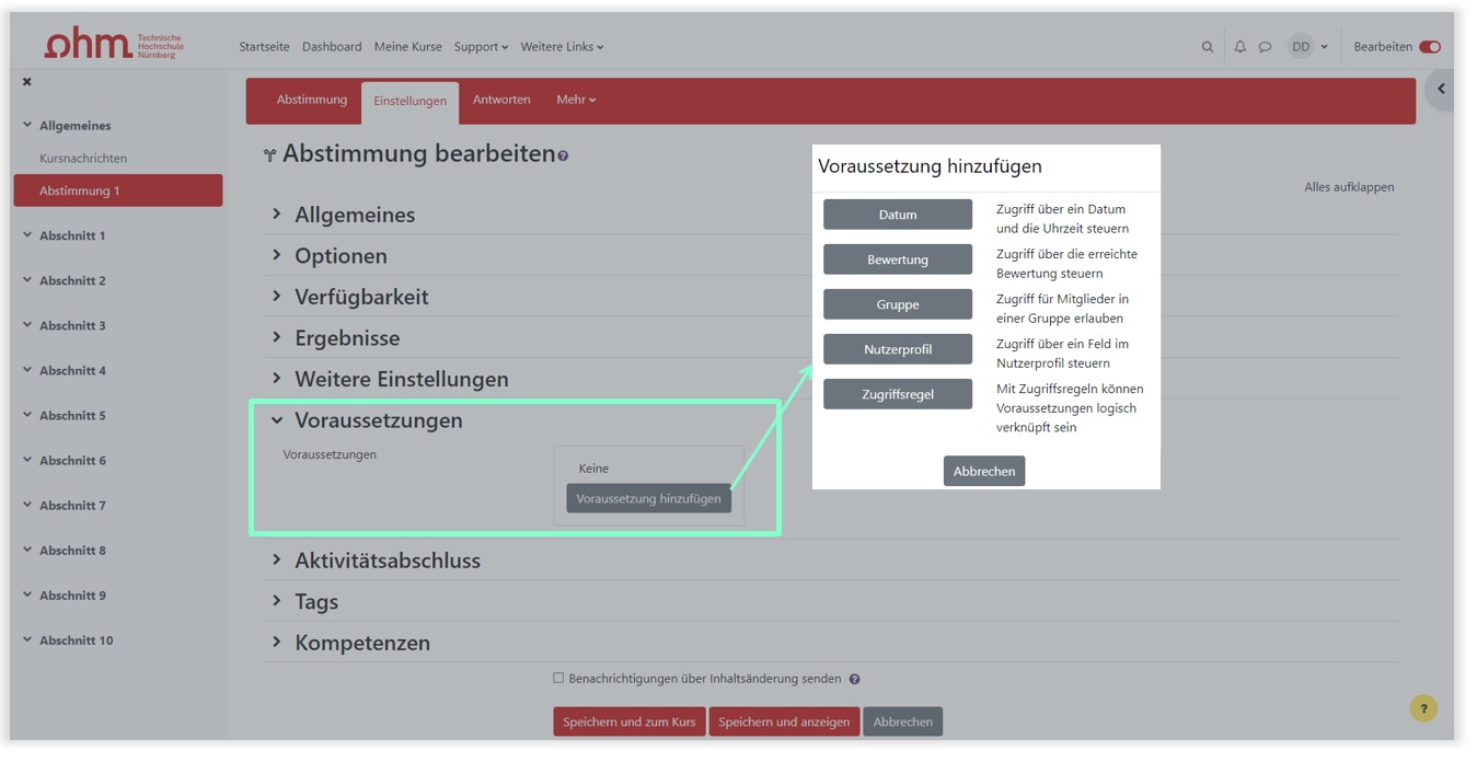 Voraussetzungen ermöglichen es, den Zugriff auf einen Abschnitt, eine Aktivität oder Arbeitsmaterial an Bedingungen zu knüpfen. Solche Voraussetzungen können sein: