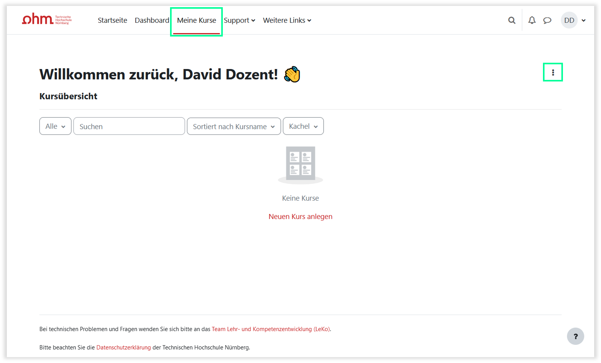 Navigieren Sie über das Menü oben in den Reiter Meine Kurse. Klicken Sie anschließend rechts oben auf die drei Punkte und wählen Neuer Kurs.