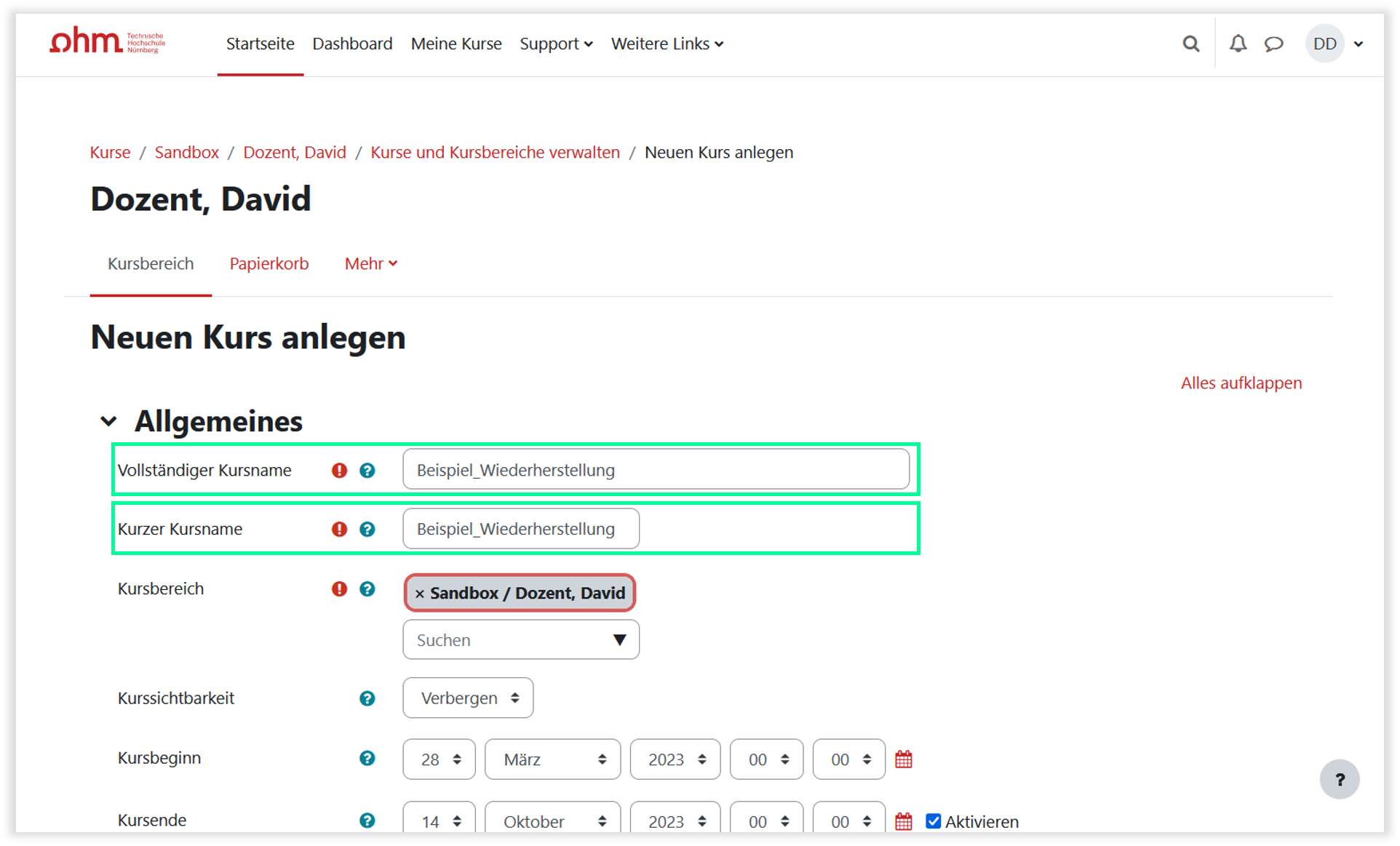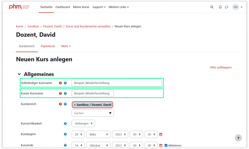 Geben Sie nur die nötigen Kurseinstellungen ein (Name, Kurzname). Alle weiteren Angaben werden über die Sicherungsdatei direkt aus dem bestehenden Kurs übernommen. Achtung: Wenn Sie Fakultätsmanager*in Ihrer Fakultät sind, müssen Sie zusätzlich darauf achten, den richtigen Kursbereich auszuwählen.