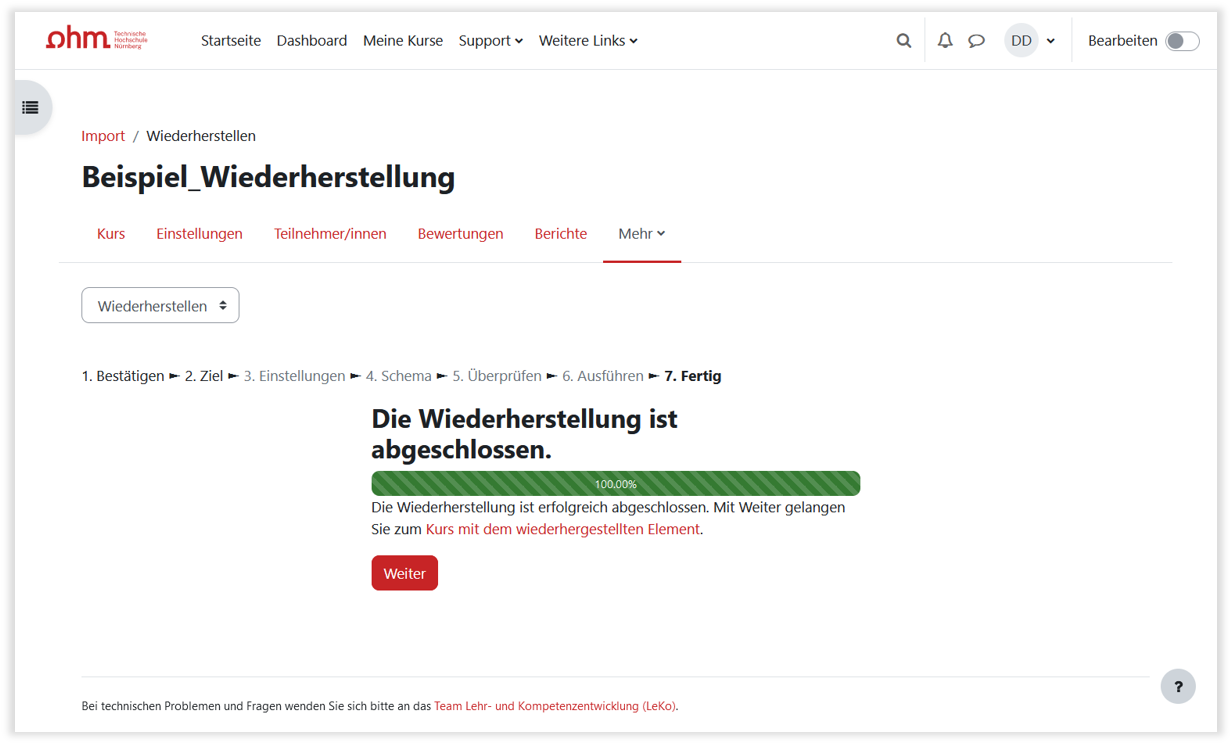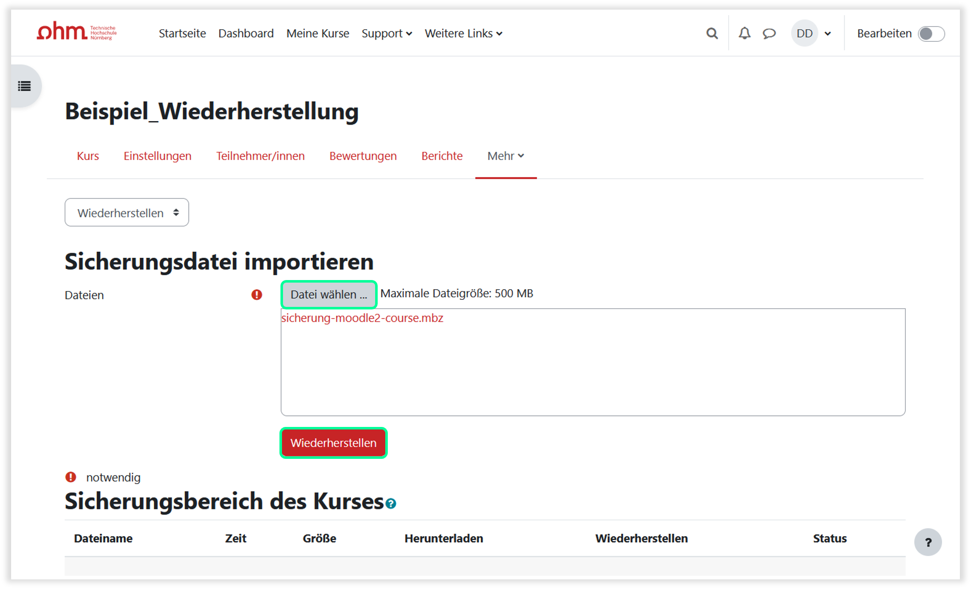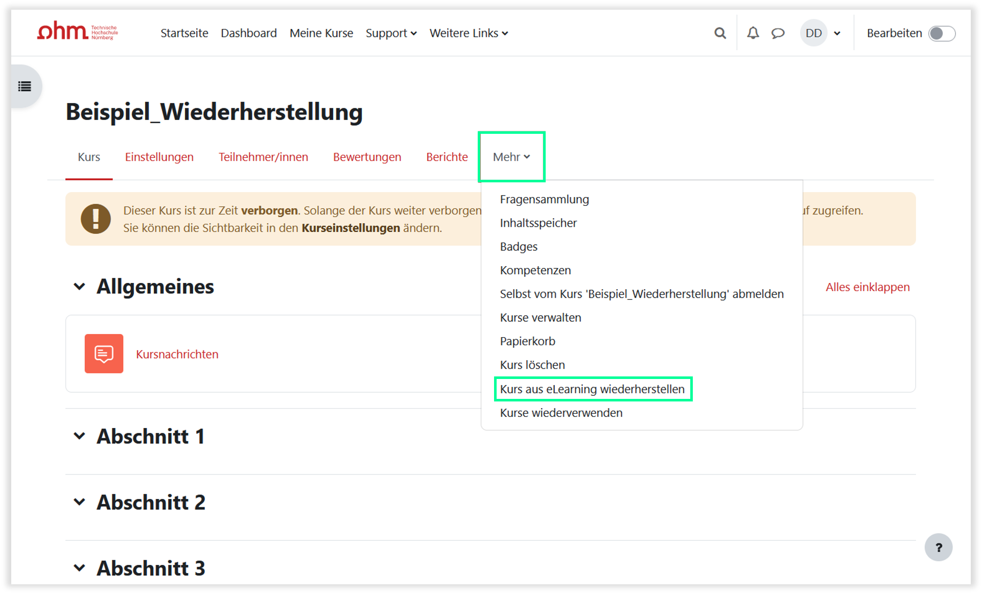 Bleiben Sie in dem soeben neu erstellten Kurs. Wählen Sie oben in der Kursnavigation den Punkt Mehr und klicken im Dropdown-Menü auf Kurs aus eLearning wiederherstellen.