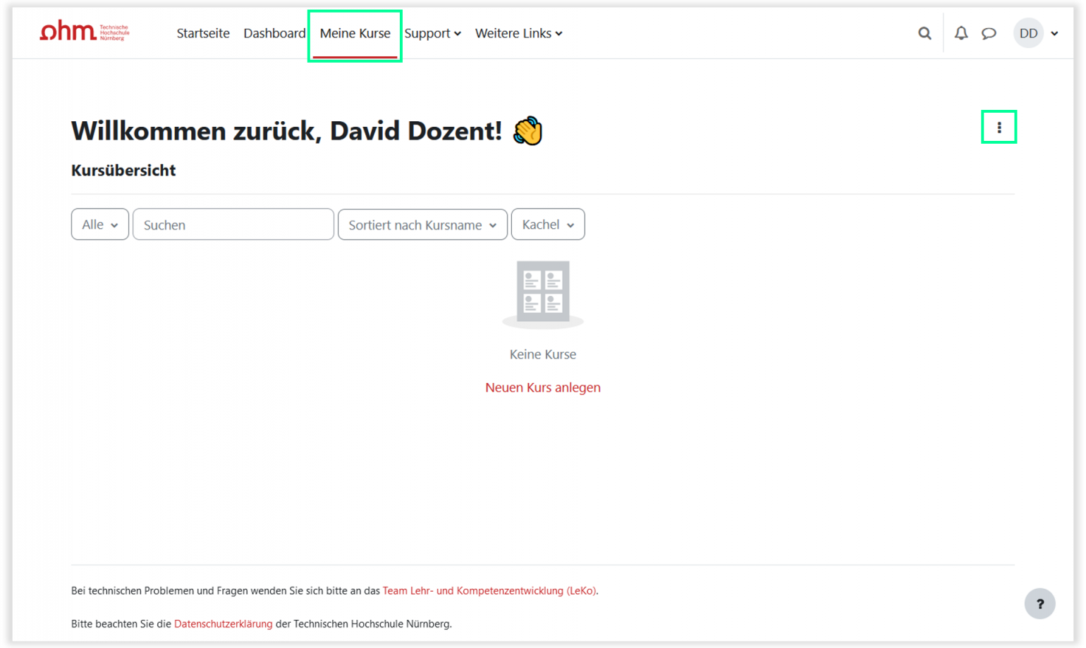 Navigieren Sie über das Menü oben in den Reiter Meine Kurse. Klicken Sie hier rechts oben auf die drei Punkte und wählen Neuer Kurs.