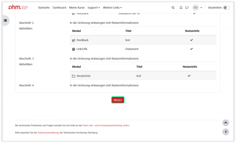 In diesen Kurs wiederherstellenund dort aufAlle Inhalte eines vorhandenen Kurses löschen und dann wiederherstellen. Drücken Sie anschließend am Ende der Seite aufWeiter - Alle weiteren Einstellungen beibehalten (3x am Seitenende auf