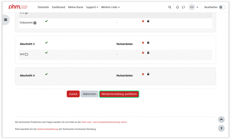 Wechseln Sie hier auf Seite 2 in den Abschnitt In diesen Kurs wiederherstellen  und dort auf Alle Inhalte eines vorhandenen Kurses löschen und dann wiederherstellen  . Drücken Sie anschließend auf Weiter.
