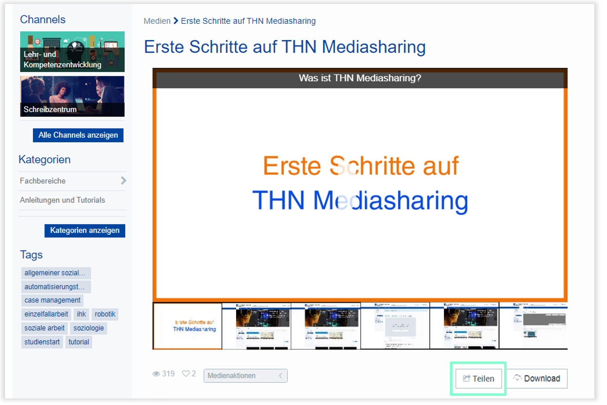 - Loggen Sie sich auf THN Mediasharing ein und wählen dort das entsprechende Video aus / laden das gewünschte Video hoch.