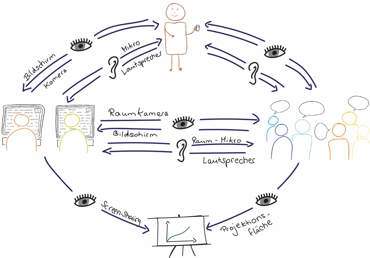 - Sie haben die Möglichkeit auf virtuell ebenso wie vor Ort anwesende Studierende zuzugehen (z.B. direkte Ansprache, Chat).