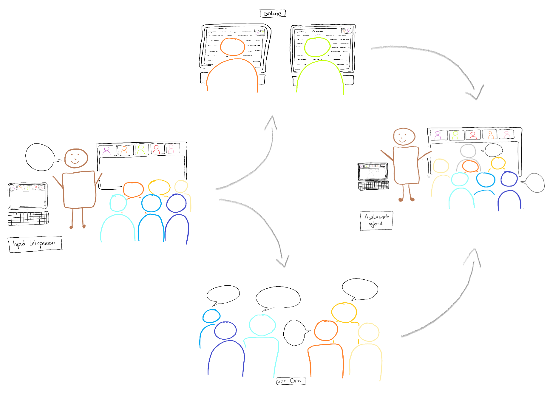 Nach einem theoretischen Input durch die Lehrperson gehen die vor Ort und die online Teilnehmenden jeweils in Kleingruppen. Die Vor-Ort-Gruppen haben den Auftrag, Fragen zum Input zu sammeln (z.B.: „Welche Frage würden Sie Ihren Kommiliton:innen stellen, um herauszufinden, ob sie den Inhalt verstanden haben?“). Die Online-Gruppen sehen sich in dieser Zeit ein Video mit vertiefenden Infos oder einem Anwendungsbeispiel an. Im Anschluss stellen die Vor-Ort-Gruppen nacheinander ihre Fragen, die von den Online-Gruppen beantwortet werden müssen.