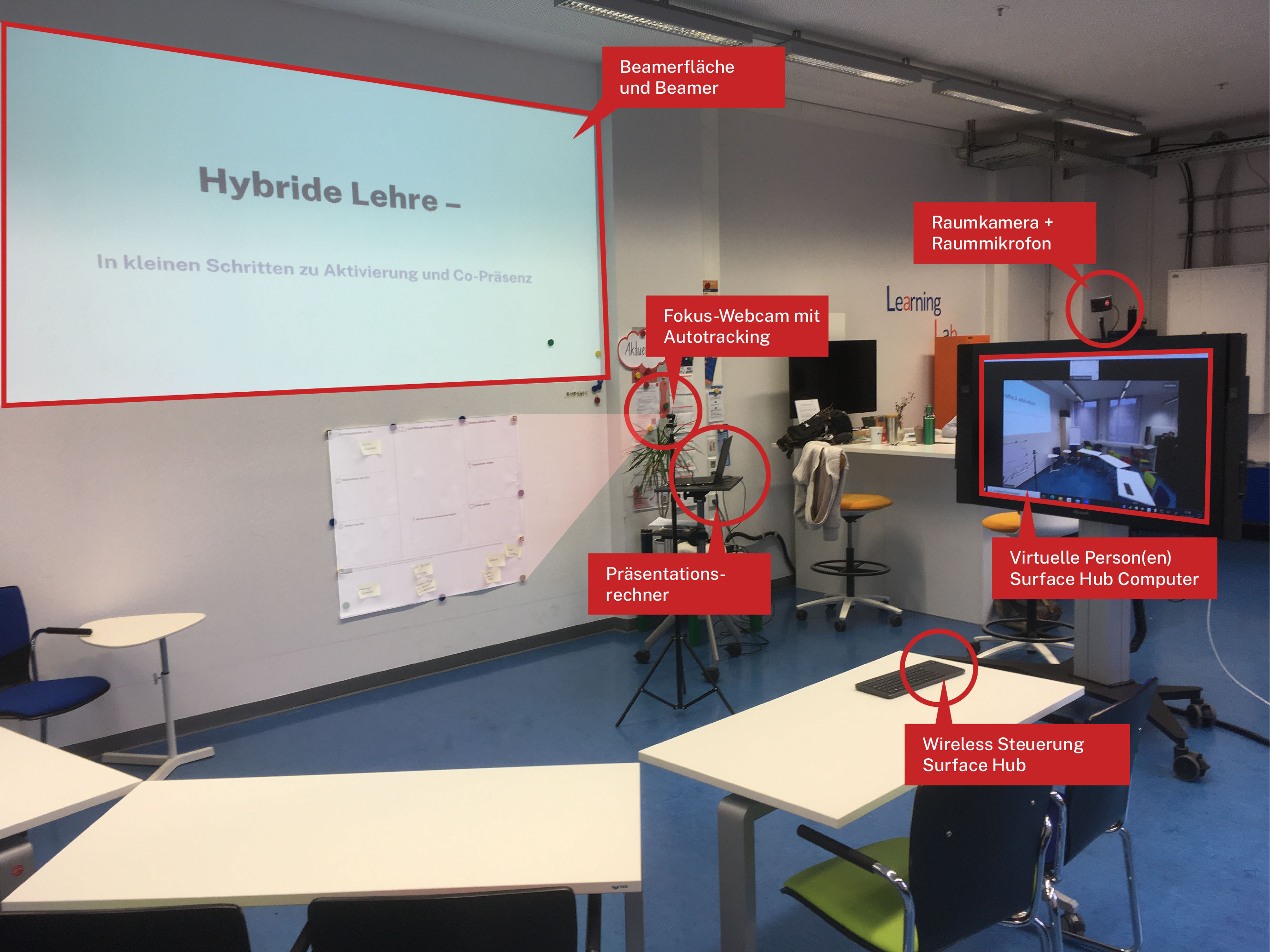 [Abbildung: Hybride Lehre im Learning Lab: Das Surface Hub in Verbindung mit einer Fokuskamera ermöglicht interaktive Workshops.]